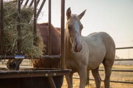 Designed to be free of head and foot traps, the Round Bale Feeder for Horses is ideal for feeding round bales of hay to your horses or to your horned cattle. This feeder features a solid skirted design to decrease hay loss and prevent leg injuries. The Architectural Grade Powder Coat Finish helps the product to resist rust, scratches, and fading to add years of life to your investment.